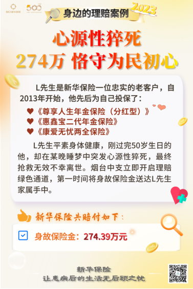 L先生是新华保险一位忠实的老客户,自2013年开始,他先后为自己投保了《尊享人生年金保险(分红型)》《惠鑫宝二代年金保险》《康爱无忧两全保险》等多份保险。L先生平素身体健康,刚刚过完自己的50岁生日,然而2023年8月的一天晚上,他却在睡梦中突发心源性猝死,最终抢救无效不幸离世。