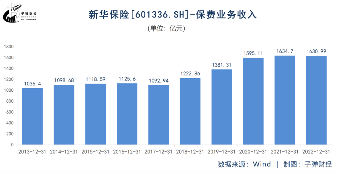 2019年至2022年,新华保险分别实现保费收入1381.31亿元、1595.11亿元、1634.7亿元与1630.99亿元,其中2019年和2020年均实现两位数增长,分别为13.0%和15.5%。