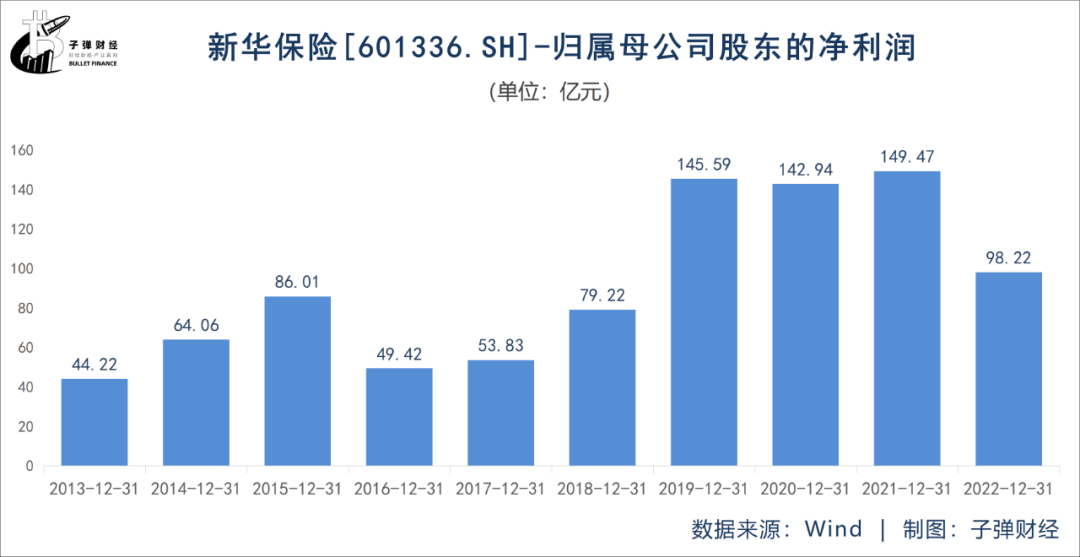 历年年报数据显示,2019年至2022年,新华保险净利润分别为145.6亿元、142.97亿元、149.51亿元和98.26亿元。