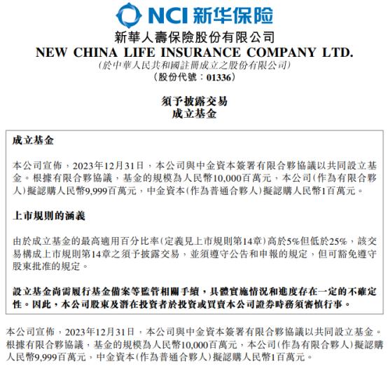 新华保险拟与中金资本携手共同设立100亿元基金。