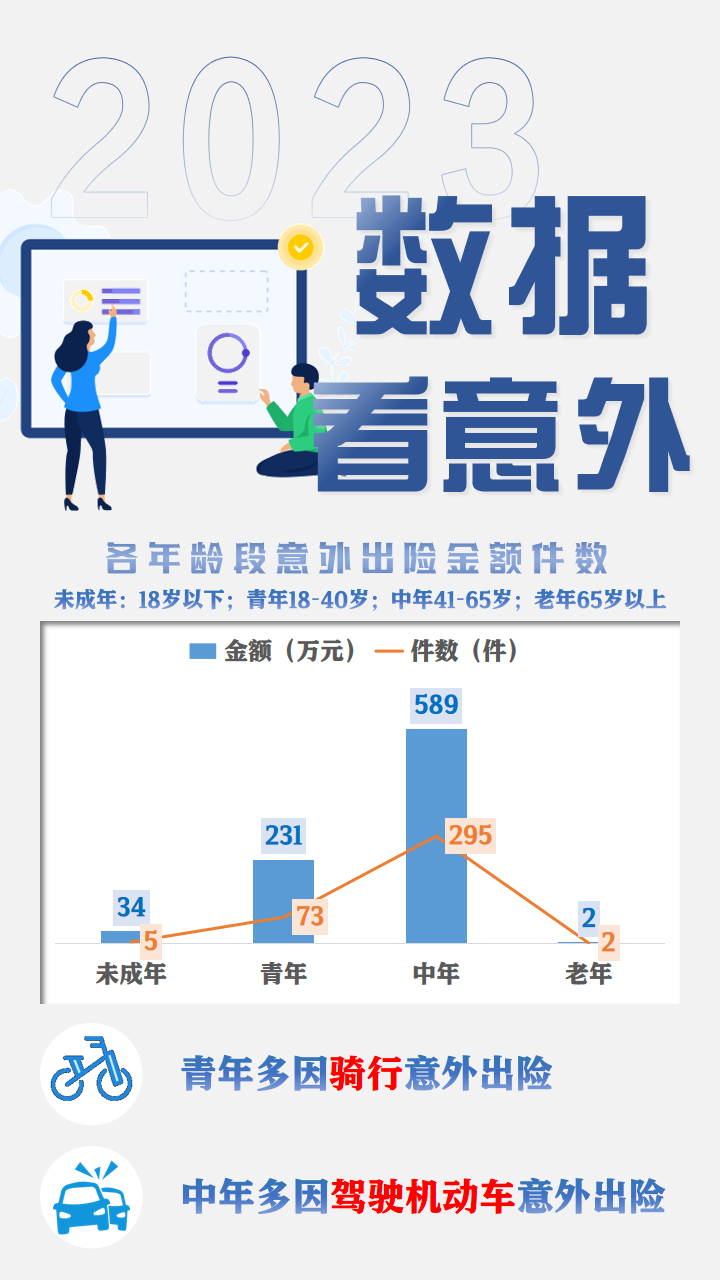 意外致身故和伤残案件高发,其中最主要的出险原因就是交通意外事故。希望所有的客户安全驾驶,青年人群多因骑行事故出险,需要注意出行速度,戴好防具;中年人群多因驾驶事故出险,需要注意不要疲劳驾驶。