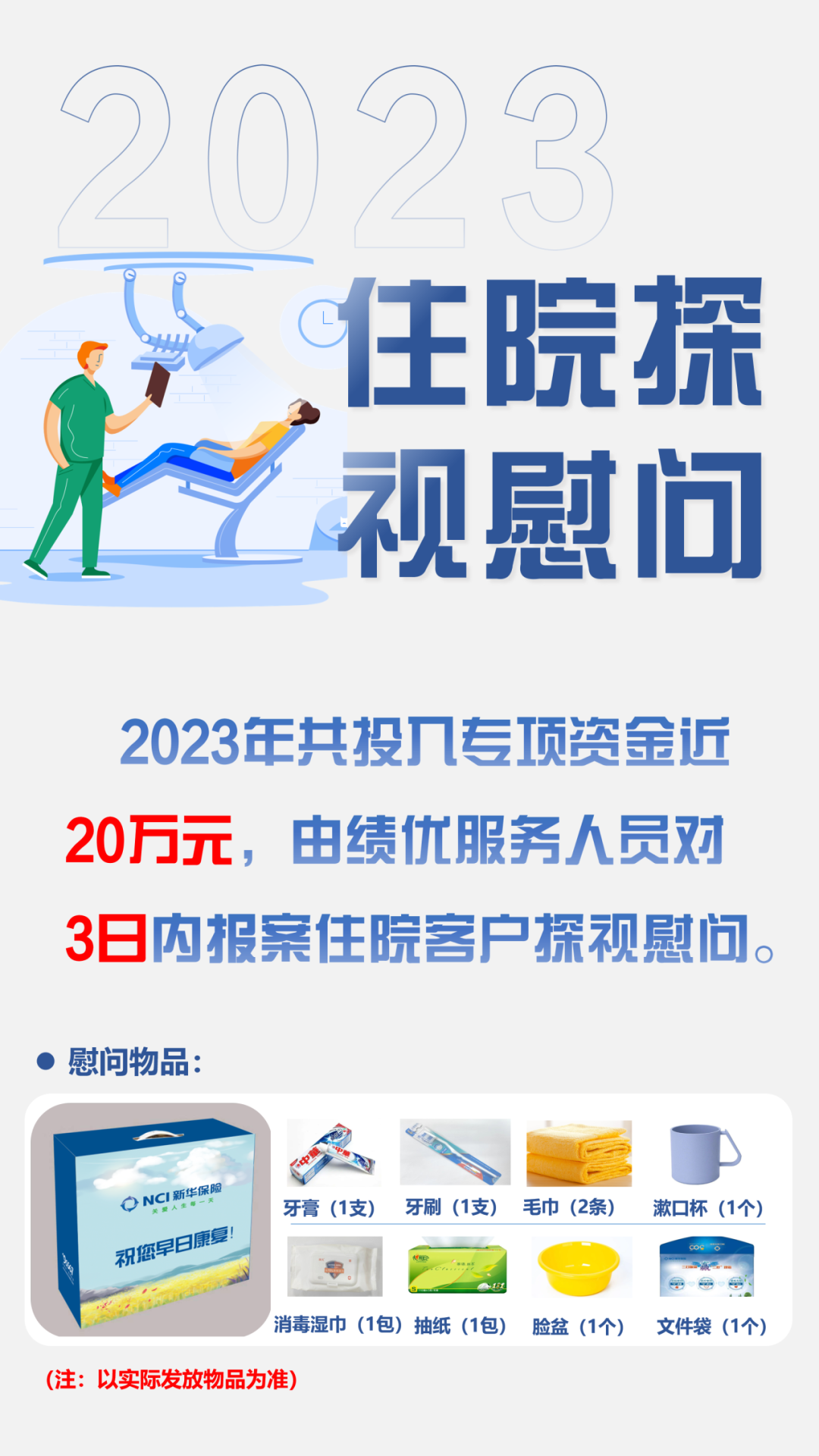 亲亲是这样,首先这个慰问礼包只针对绩优服务人员的客户发放,其次每位住院的客户需要在入院3日内报案,并且联系您的保单服务人员,他们了解情况后会上门探视慰问的。