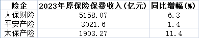 在财产险业务方面,财产险“老三家”2023年全年保费收入稳健增长,人保财险实现保费收入5158.07亿元,同比增长6.3%;平安产险实现保费收入3021.60亿元,同比增长1.4%;太保产险实现保费收入1903.27亿元,同比增长11.4%。