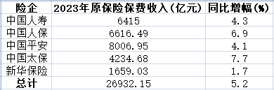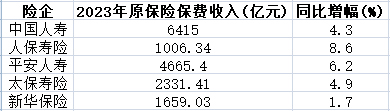 具体来看,2023年,中国人寿累计保费收入6415亿元,同比增长4.3%;人保寿险累计保费收入1006.34亿元,同比增长8.6%;平安人寿累计保费收入4665.40亿元,同比增长6.2%;太保寿险累计保费收入2331.41亿元,同比增长4.9%;新华保险累计保费收入1659.03亿元,同比增长1.7%。