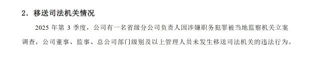 2025年第三季度偿付能力报告中,新华人寿也披露一名省级分公司负责人因涉嫌职务犯罪被当地监察机关立案调查。