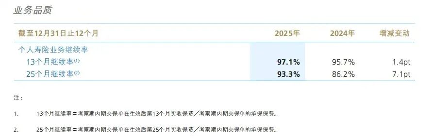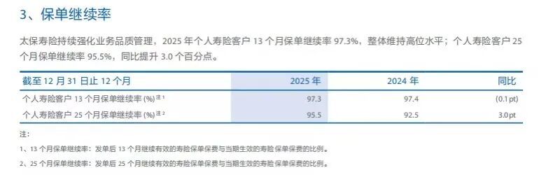 太保寿险继续保持平顺感,其2025年度报告显示,2025年13个月保单继续率97.3%,25个月保单继续率95.5%,综合退保率1.4%。中国太保2025年度报告提及,业务品质管理得到强化,保单继续率保持高位。结合继续率和退保率来看,太保的“后劲”,未必依靠续期体量说话,但在保单留存和退保控制上保持了较好状态,而这也同样是人身险业务的重要“后劲”来源。