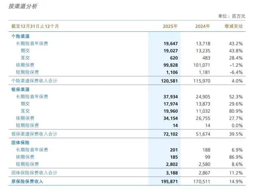 新华保险的人身险增长,也不是只依靠一个渠道。其2025年度报告显示,2025年个险渠道保费收入1205.81亿元,同比增长4.0%,银保渠道保费收入721.02亿元,同比增长39.5%,个险渠道长期险首年保费同比增长43.2%,银保渠道长期险首年保费同比增长52.3%。个险渠道保持增长,银保渠道增速更快,渠道结构变化与首年业务扩张对当期业绩形成呼应。
