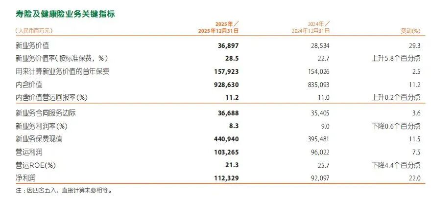 中国平安的价值重心则转向厚度,其2025年度报告显示,中国平安寿险及健康险业务新业务价值368.97亿元,同比增长29.3%,内含价值9286.30亿元,同比增长11.2%,新业务价值率(按标准保费)28.5%,同比上升5.8个百分点。新业务价值、内含价值和新业务价值率均处于较高水平,体现出平安寿险及健康险业务较厚的价值基础。