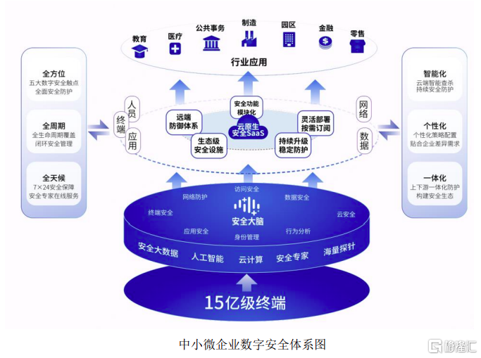 三六零的中小微企业数字安全体系,是以安全大脑为基座,安全厂商面向中小微企业提供云原生安全SaaS服务,将安全能力开放给广大中小微企业,帮助中小微企业敏捷、低门槛地构建全面的安全防御体系。
