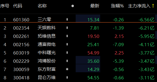 三六零主力资金净流出额超6亿元