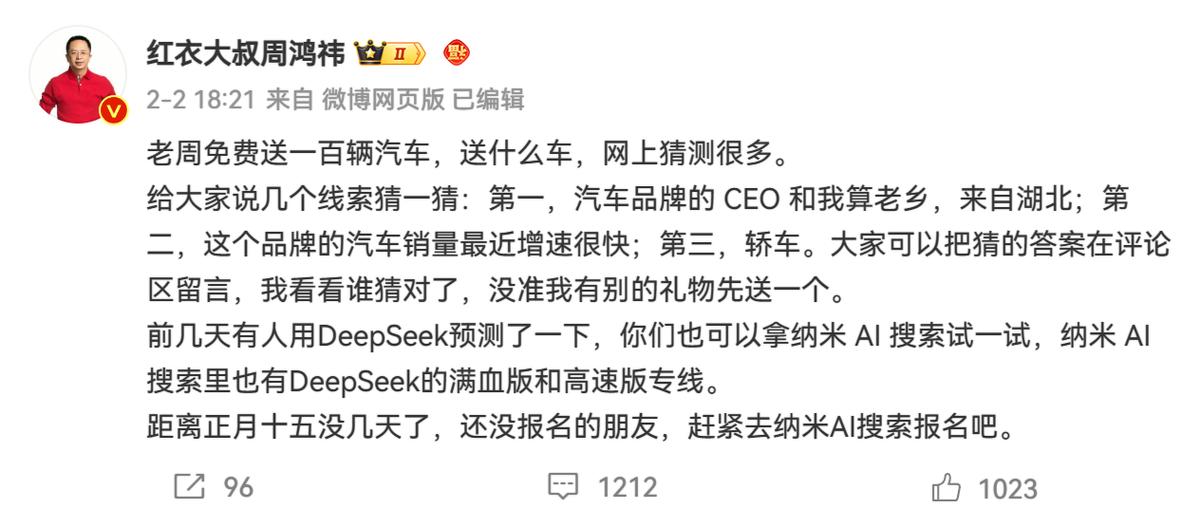 纳米搜索,就是去年末周鸿祎特地拍了短剧推广的产品。勤奋的周鸿祎,不忘每条微博都带上推广纳米搜索的DeepSeek专线。过年期间,周鸿祎还发起“百车行动”,用送一百台国产品牌新能源汽车的方式,推广纳米搜索。