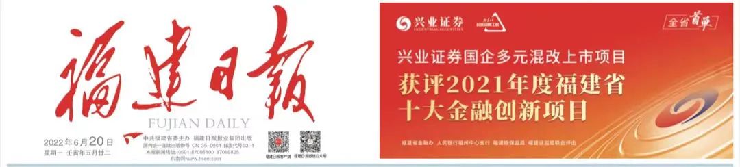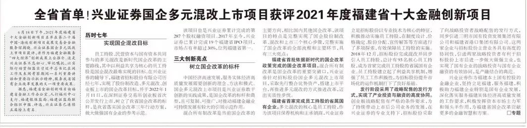 6月20日《福建日报》头版刊发了《兴业证券国企多元混改上市项目获评2021年度福建十大金融创新项目》,向社会公众介绍了项目的三大亮点,树立了新时代福建国企改革的标杆。