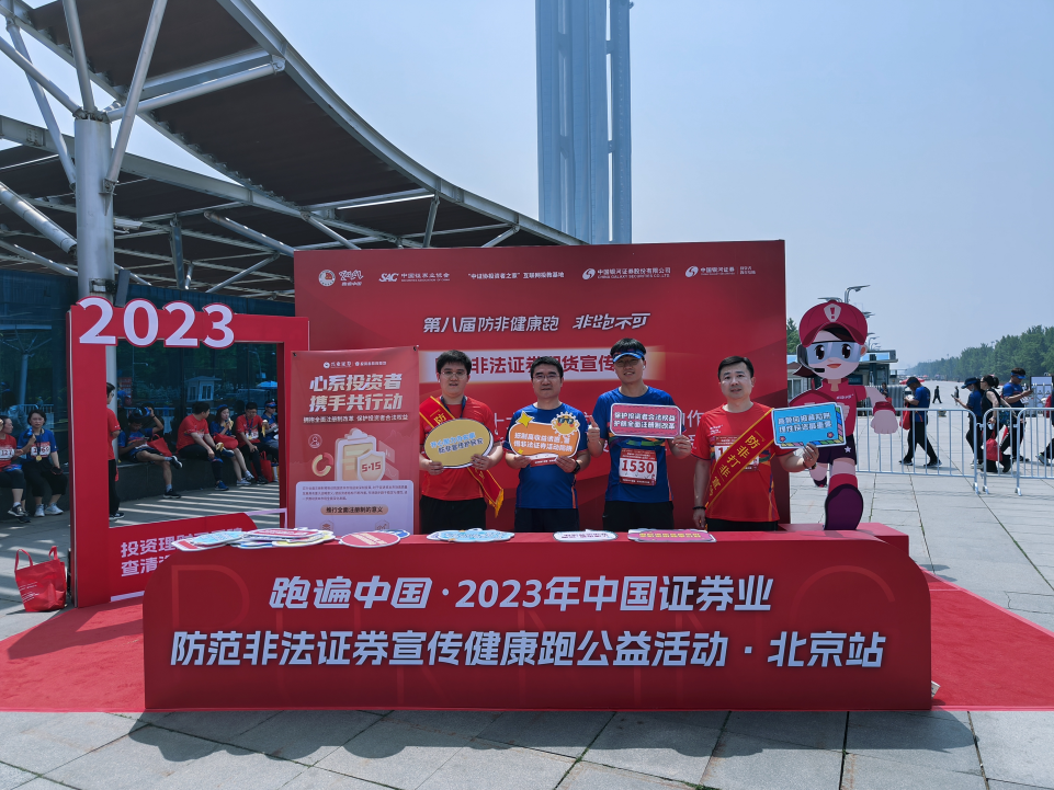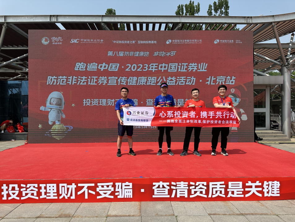 中国证券业防范非法证券宣传线上健康跑公益活动由中国证券业协会联合中国田径协会举办,以健康运动赋能理性投资。在近年的兴业证券站跑道上,该活动搭载了防非主题健步走、短视频大赛、摄影大赛、文创设计大赛等系列活动,成立线上“防非知识直播补给站”,打造“防非教育+新媒体宣传+健康跑”的跨界融合。2023年,兴业证券继续助力中证协防非健康跑活动,总部与北京分公司共同参与第八届防非健康跑线下首站活动,现场通过设置宣传展台、发放投教折页、参与启动仪式、完成五公里健康跑等更加贴近群众生活的形式开展宣传,引导投资者关注全面注册制背景下的非法证券期货活动,切实履行保护投资者合法权益的职责。