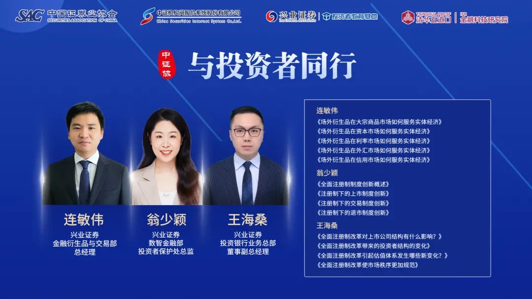 《与投资者同行》是中国证券业协会联合清华大学金融科技研究院共同启动的金融科普公益活动,帮助投资者提升对企业的价值判断和风险识别能力。兴业证券积极参与了其中第三季系列金融科普公益视频开发录制,由衍生品与交易部总经理连敏伟、投资银行业务总部董事副总经理王海桑、数智金融部投资者保护处总监翁少颖等资深专家讲师针对注册制改革的成效、聚焦注册制改革对服务国家科技创新、改善资本市场生态结构、提升投资者保护等方面带来的积极变化以及衍生品相关知识等内容进行讲解,用11个系列短视频科普“注册制”硬核知识,帮助投资者足不出户、与时俱进地了解全面注册制改革重点内容。
