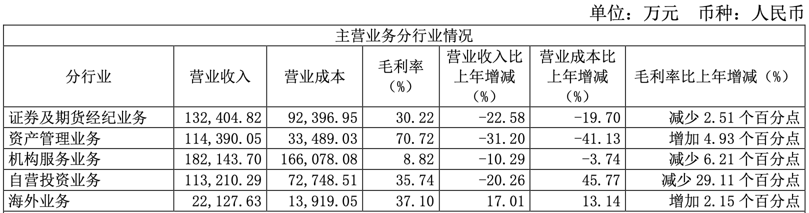 兴业证券主要业务包括证券及期货经纪业务、资产管理业务、机构服务业务、自营投资业务和海外业务等,澎湃新闻注意到,除海外业务营收实现正向增长外,其他业务营收均出现不同程度的下滑。