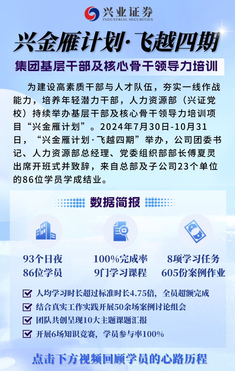 “兴金雁计划”将持续面向集团基层干部和核心骨干举办,第五期有来自39家分公司的127位学员参加,为建设一流证券金融集团夯实干部队伍。