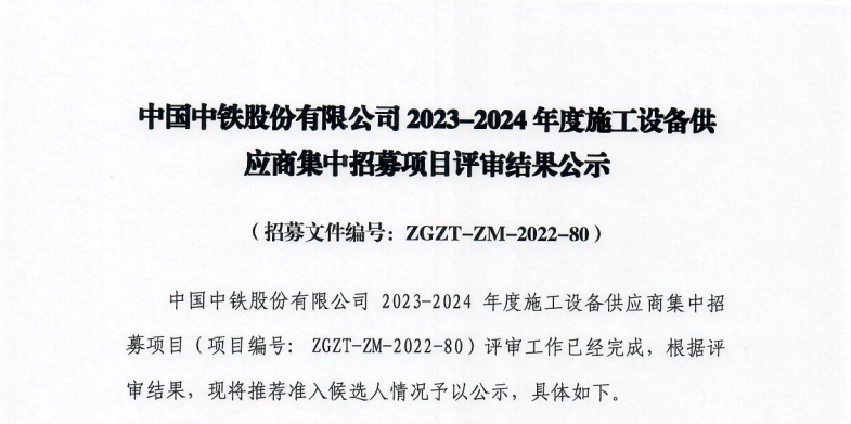近日,中国中铁股份有限公司发布了2023-2024年度施工设备供应商评审结果,五新装备连续8年入围混凝土湿喷机组年度供应商。