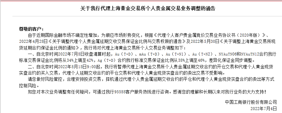 工商银行公告显示,具体调整内容包括一是自北京时间2022年7月8日收盘清算时起,Au(T+D)、mAu(T+D)、Au(T+N1)、Au(T+N2)、NYAuTN06和NYAuTN12合约工行标准交易保证金比例将从34%上调至42%,Ag(T+D)合约工行标准交易保证金比例从38%上调至46%,差异化保证金同步调整。