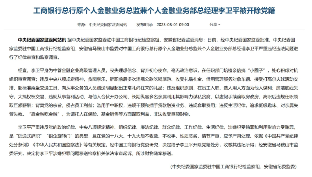 公开信息显示,李卫平严重违反党的政治纪律、中央八项规定精神、组织纪律、廉洁纪律、群众纪律、工作纪律、生活纪律,涉嫌犯受贿罪和利用影响力受贿罪。作为“逃逸式辞职”“银企旋转门”的典型,被给予开除党籍处分,收缴违纪所得并将涉嫌犯罪问题移送检察机关依法审查起诉。