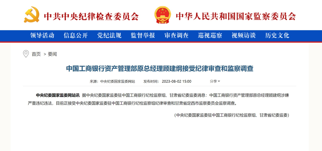 8月2日15时,中央纪委国家监委网站通知,中国工商银行资产管理部原总经理顾建纲接受纪律审查和监察调查。通告内容显示,据中央纪委国家监委驻中国工商银行纪检监察组、甘肃省纪委监委消息:中国工商银行资产管理部原总经理顾建纲涉嫌严重违纪违法,目前正接受中央纪委国家监委驻中国工商银行纪检监察组纪律审查和甘肃省定西市监察委员会监察调查。