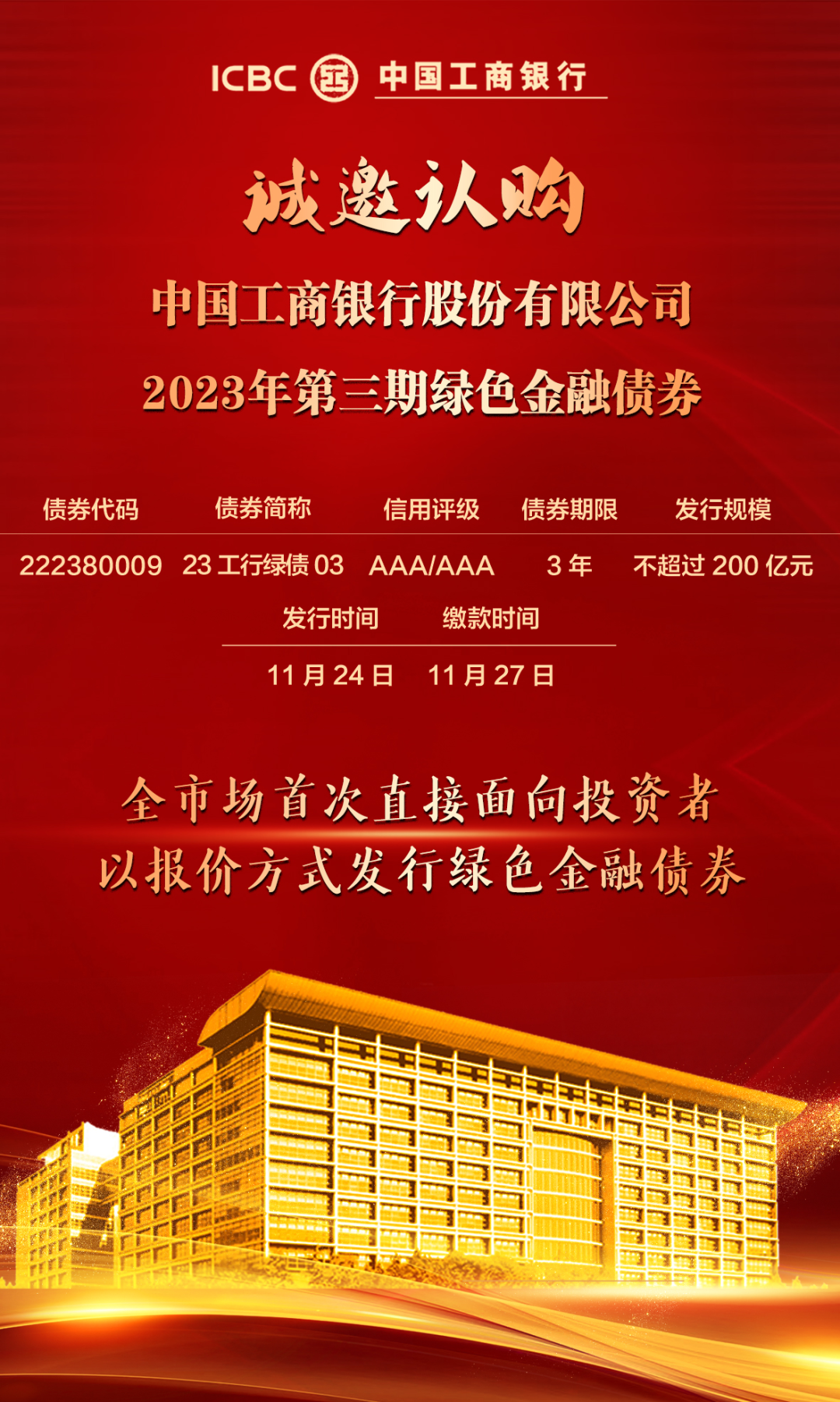 2023年11月24日,中国工商银行股份有限公司将在全国银行间债券市场发行2023年第三期绿色金融债券。本期债券发行规模为不超过人民币200亿元,债券期限为3年,主体与债项评级均为AAA。诚邀投资人询价认购。
