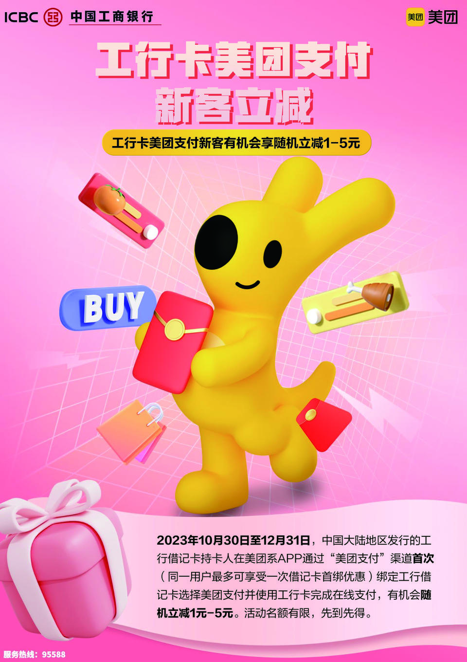 2023年10月30日至12月31日,中国大陆地区发行的工行借记卡持卡人在美团系APP通过“美团支付”渠道首次(同一用户最多可享受一次借记卡首绑优惠)绑定工行借记卡选择美团支付并使用工行卡完成在线支付,有机会随机立减1元-5元。活动名额有限,先到先得。