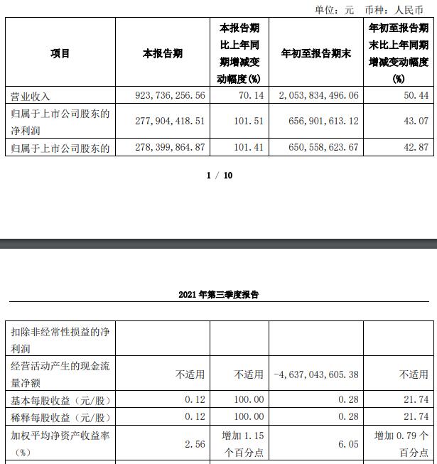 今年第三季度,国联证券实现营业收入9.24亿元,同比增长70.14%;归属于上市公司股东的净利润2.78亿元,同比增长101.51%;归属于上市公司股东的扣除非经常性损益的净利润2.78亿元,同比增长101.41%;基本每股收益0.12元/股,同比增长100.00%;加权平均净资产收益率2.56%,比上年同期增加个1.15个百分点。