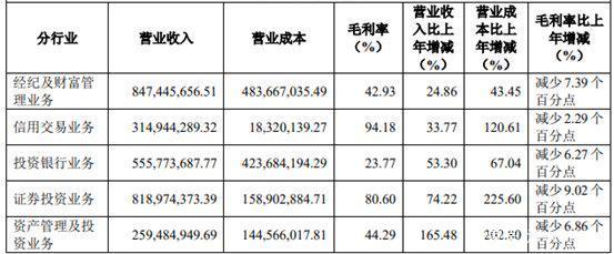 其中,经纪及财富管理业务收入8.47亿元,同比增24.86%;投资银行业务收入5.56亿元,同比增53.30%;资产管理及投资业务收入2.59亿元,同比增165.48%;信用交易业务收入3.15亿元,同比增33.77%;证券投资业务收入8.19亿元,同比增74.22%。