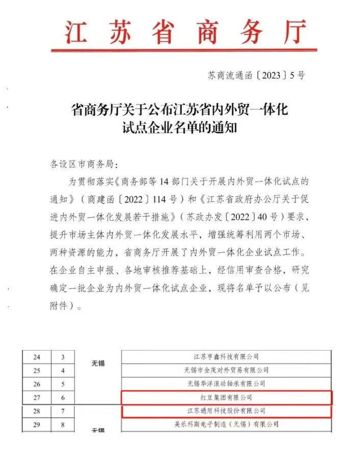 1月5日,江苏省商务厅公布了江苏省《内外贸一体化试点企业名单》,通用股份成功获评。内外贸一体化试点工作旨在通过培育一批内外贸一体化经营企业,打造内外贸融合发展平台,形成具有国际竞争力、融合发展的产业集群,建立健全促进内外贸一体化发展的体制机制,进而促进内外贸融合发展。2022年,通用股份紧抓国内国外双循环,泰国生产基地进入全面投产,柬埔寨项目加速建设,深入开展与北美等地区头部客户的战略合作,加大品牌建设和全球营销网络覆盖,实现了重要突破。