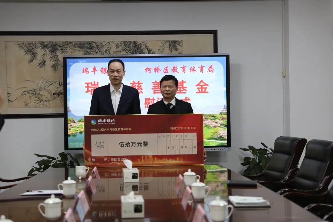1月13日下午,柯桥区教体局4楼会议室内暖意融融,瑞丰银行党委书记、董事长章伟东郑重地将一张50万元支票,递到柯桥区教体局党工委书记、局长徐迅手中。这一张支票,今年将为200名柯桥贫因学子缓解生活困难,带去更多生活的暖意。这一张支票,也是瑞丰银行今年冬季,广泛开展的“三助慈善”活动中的其中一笔捐赠。