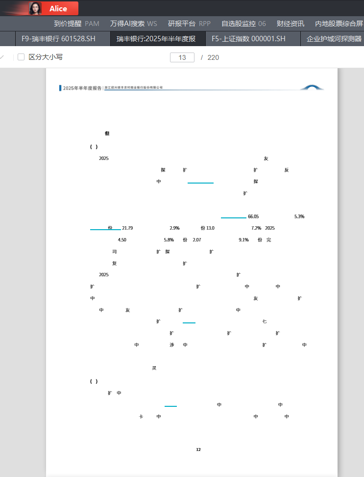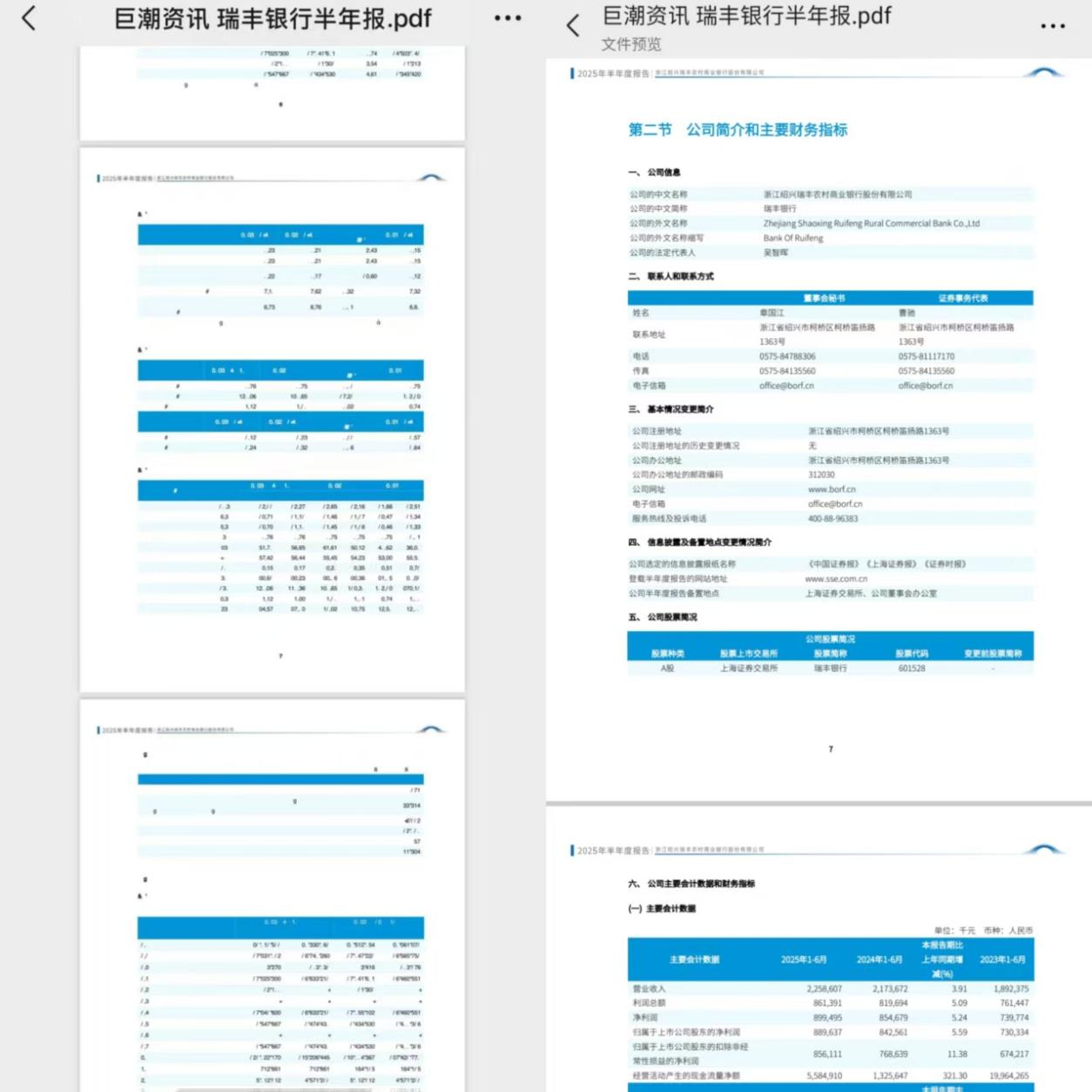 8月26日晚间,瑞丰银行(601528.SH)发布了2025年半年度报告。8月27日早上,经济观察报记者发现,从新浪财经和巨潮资讯网等三方平台下载的瑞丰银行半年报,以及在Wind平台的瑞丰银行半年报原文链接中,均有几十页显示为“乱码”。