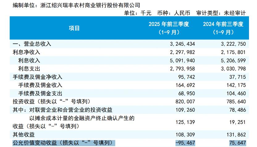 需要指出的是,尽管公允价值变动收益出现亏损,但若加上投资收益,在瑞丰银行前三季度营收中的占比约为 21.22%。