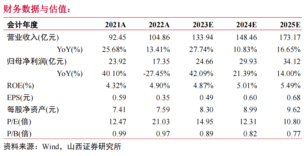 公司发布2022年报及2023一季报,2022年实现营业收入104.86亿元,同比增加13.41%,实现归母净利润17.35亿元,下滑27.45%,加权平均ROE为4.62%,较上年下降3.80pct。2023Q1实现营业收入22.54亿元,同比增加68.44%;实现归母净利润5.83亿元,同比增长412.84%。