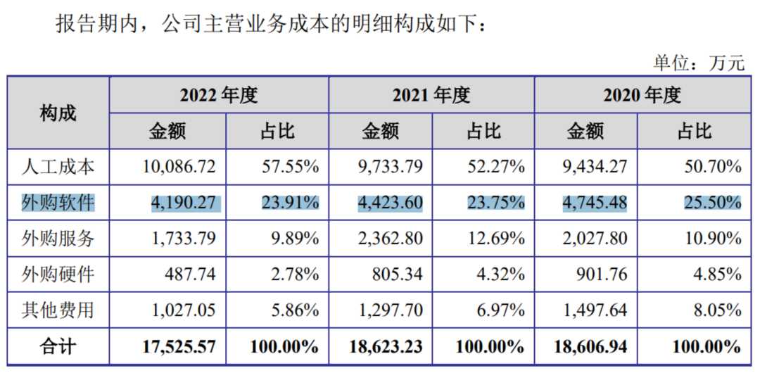 报告期内,公司各期外购软件分别为4.745.48万元、4.423.60万元和4.190.27万元,占当期营业成本的比重分别为25.50%、23.75%和 23.91%。