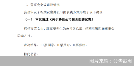 9月26日,东吴证券发布公告表示,公司董事会同意聘任方苏、郭家安为公司副总裁,任期至第四届董事会届满之日。
