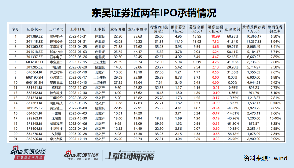 东吴证券成功保荐的21家IPO公司中,隆扬电子、建科股份、荣旗科技三家公司超募资金最多,承销保荐费用也最高,分别超募10.99亿元、7.82亿元和5.66亿元。