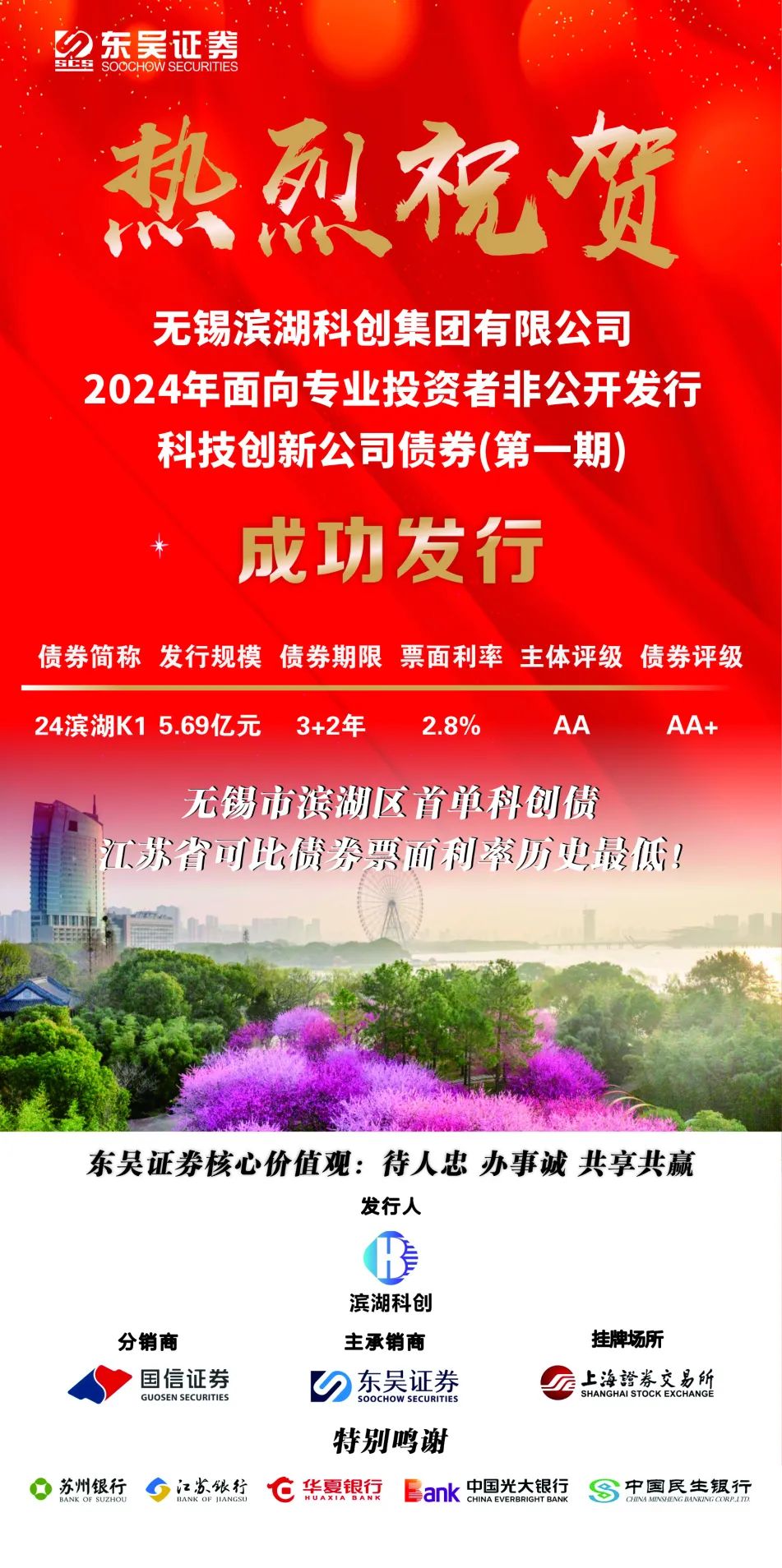 2024年3月28日,东吴证券作为主承销商的“无锡滨湖科创集团有限公司2024年面向专业投资者非公开发行科技创新公司债券(第一期)”在上海证券交易所成功发行,发行规模5.69亿元,票面利率2.80%。本项目是无锡市滨湖区首单科创债,吸引了大量专业投资者参与,票面利率也居新低。本期债券募集资金将通过基金投资对科创企业进行出资,对丰富科创债发行主体、拓宽支持科创企业融资渠道,贯彻落实科创驱动发展战略具有重要意义。