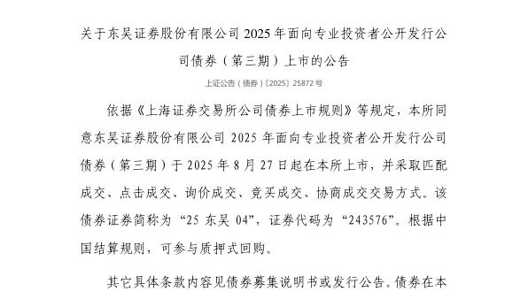 依据《上海证券交易所公司债券上市规则》等规定,上交所同意东吴证券股份有限公司2025年面向专业投资者公开发行公司债券(第三期)于2025年8月27日起在上交所上市,并采取匹配成交、点击成交、询价成交、竞买成交、协商成交交易方式。该债券证券简称为“25东吴04”,证券代码为“243576”。根据中国结算规则,可参与质押式回购。