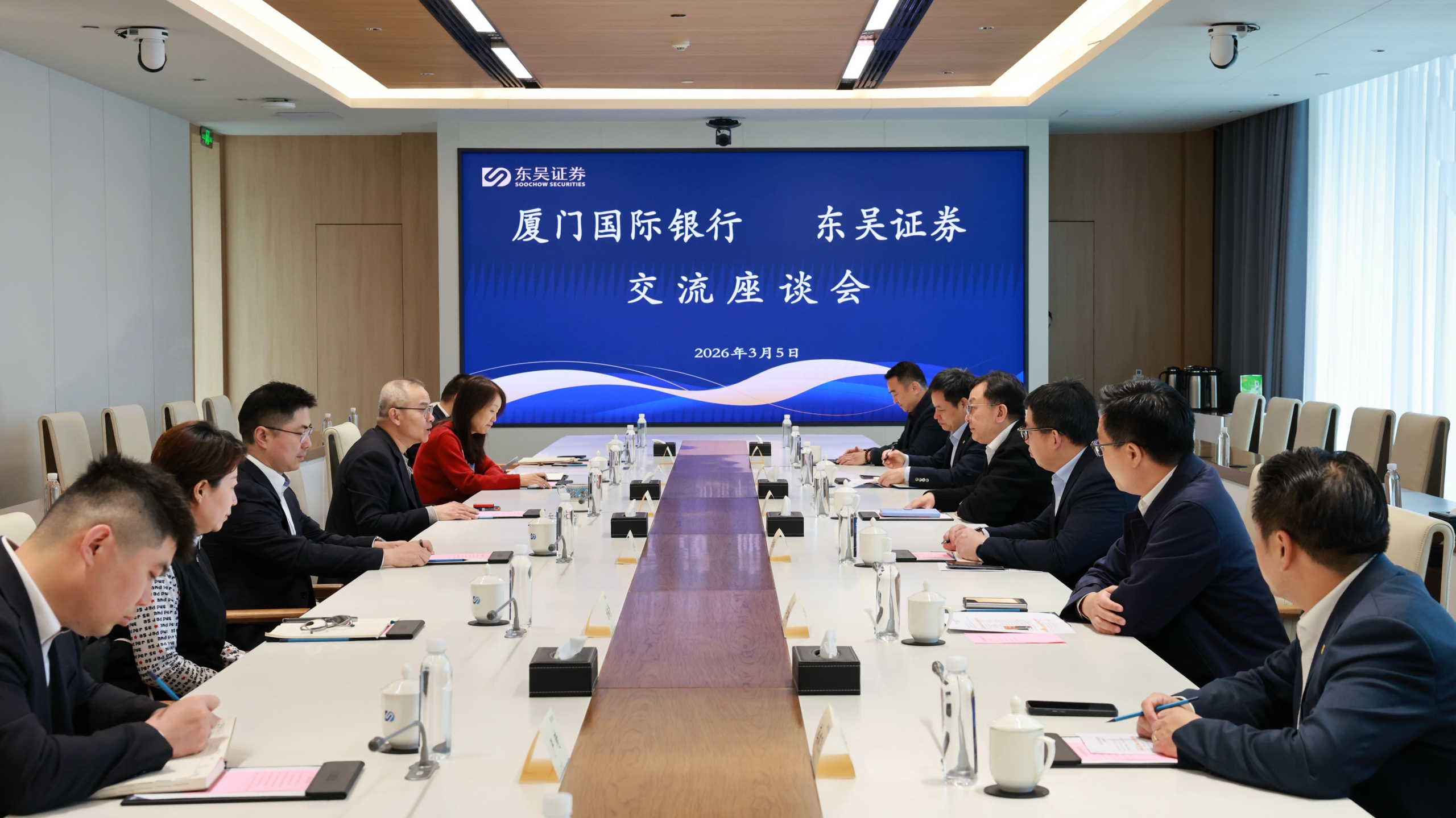 3月5日,厦门国际银行党委委员、副行长兼厦门国际投资有限公司总经理郑威率队到访东吴证券。公司党委书记、董事长范力接待郑威一行,双方围绕深化银证合作进行了深入座谈交流。