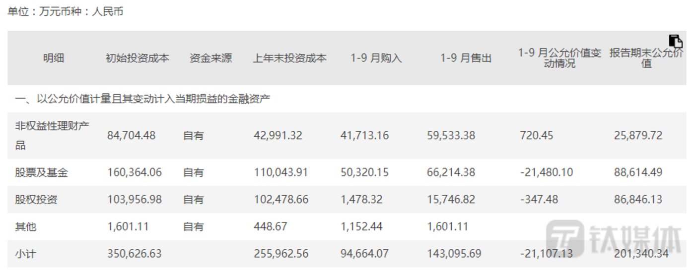 三季报显示,九牧王交易性金融资产减少3.7亿元,余额5.5亿元,同比减少40.62%。其中1-9月买进5.03亿元的股票及基金,割肉卖出6.62亿元,亏损2.13亿元。