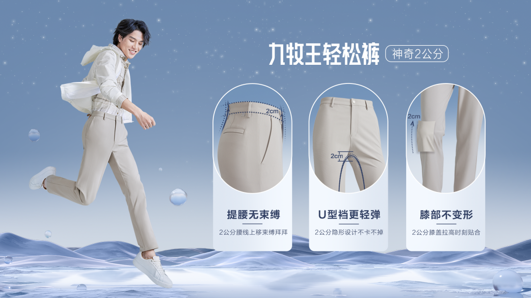 从小黑裤到轻松裤,是九牧王深入到消费者的生活场景当中去,从专业的角度去思考客户的需求,准确对消费者痛点的洞察,以及用创新技术去解决消费者的痛点。