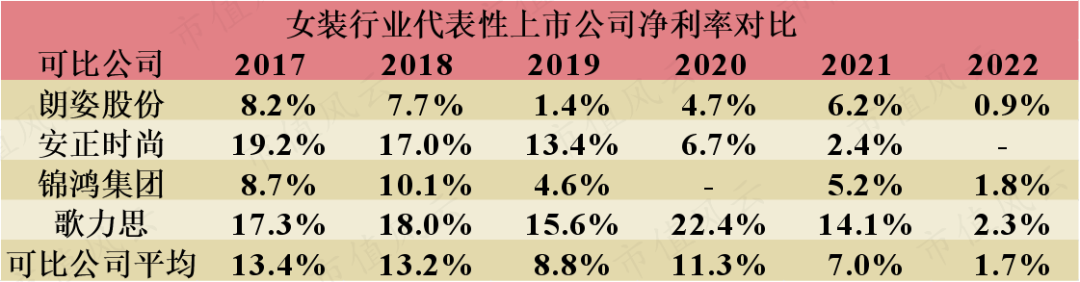 盈利水平波动可以直观反映女装市场相较于男装市场具有更大的风险:2017-2022年,女装行业代表性上市公司整体的净利率水平呈现明显的下降趋势,四家女装上市企业的平均净利率由13%降至2%左右。