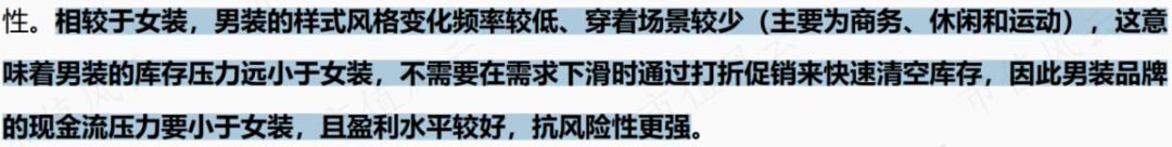 相较于女装,男装的样式风格变化频率较低、穿着场景较为固定,这意味着男装的库存压力、现金流压力都要小于女装,因而盈利能力相对更加稳定,抗风险能力更强。