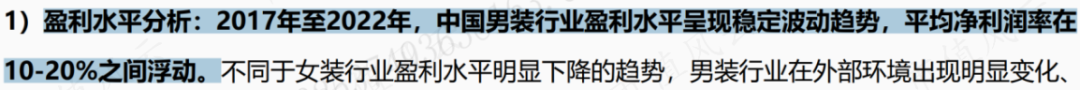 同样在2017-2022年,据头豹研究院测算,中国男装行业整体盈利水平呈现稳定波动趋势,平均净利率在10%-20%之间浮动。