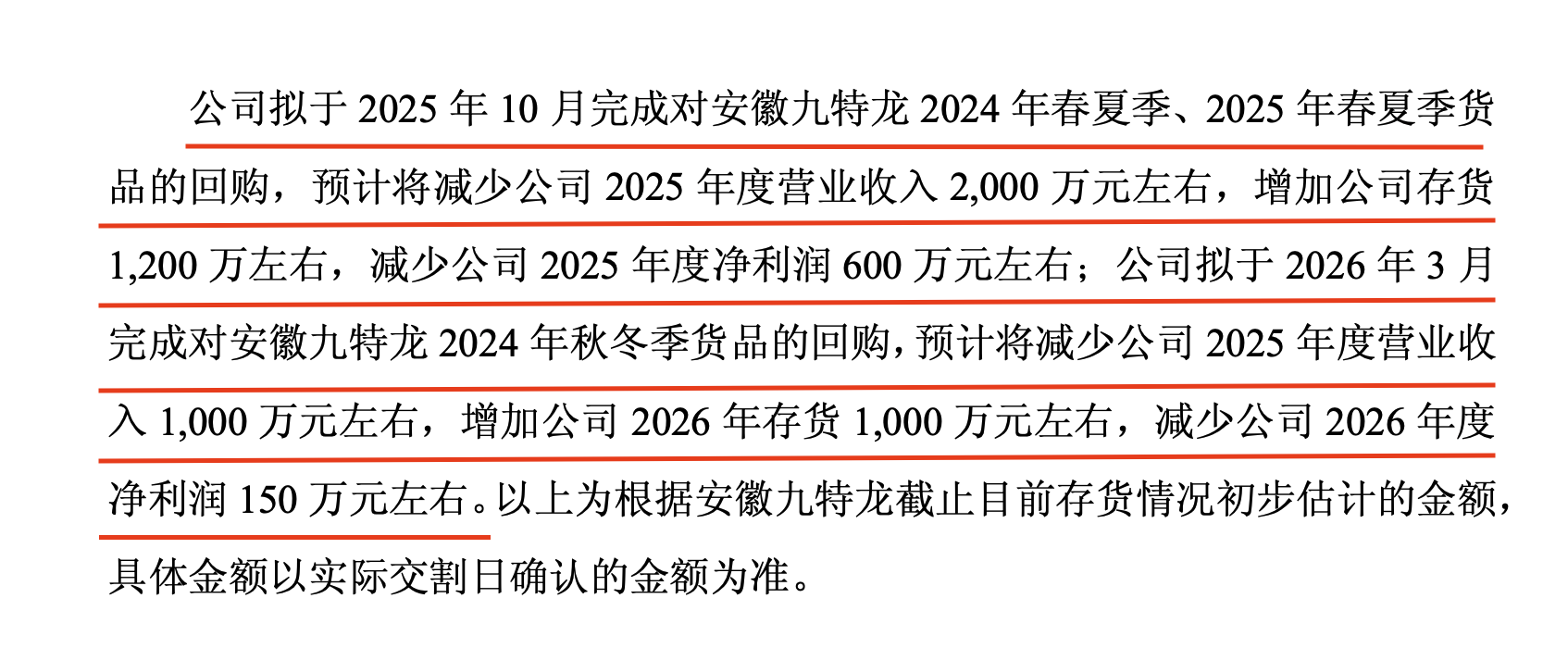 “公司拟于2026年3月完成对安徽九特龙 2024 年秋冬季货品的回购,预计将减少公司 2025 年度营业收入1000万元左右,增加公司2026年存货1000 万元左右,减少公司 2026 年度净利润 150 万元左右。”九牧王公告表示,以上为根据安徽九特龙截止目前存货情况初步估计的金额,具体金额以实际交割日确认的金额为准。