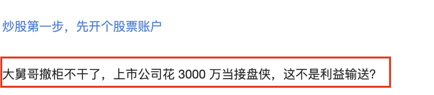 “(总经理)大舅哥撤柜不干了,上市公司花3000万当接盘侠,这不是利益输送?”有股民质疑九牧王已经涉嫌利益输送,也有股民认为此举已经侵害了中小股东的利益。