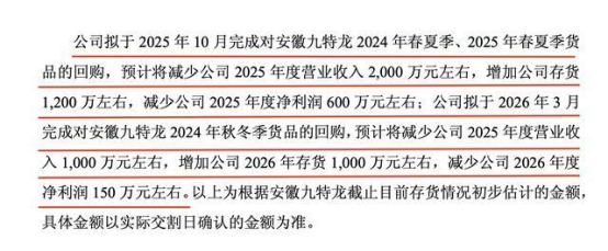 除了要支付大约 3000 万元的现金外,回购安徽九特龙 2024 年春夏季、2025 年春夏季货品的货品,预计将减少公司 2025 年度营业收入2000万元左右,增加公司存货1200万元左右,减少公司2025年净利润600 万元左右。