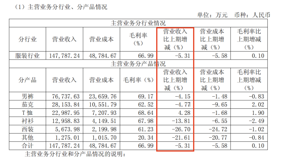 分产品数据来看,除了衬衫产品的营业收入增加了4.28%外,其他四大产品的营业收入均出现了不同程度的下滑。其中西装营业收入下降26.70%,衬衫的营业收入下降13.81%,茄克的营业收入下降4.77%,贡献最大营业收入的男裤营业收入也下降4.15%。