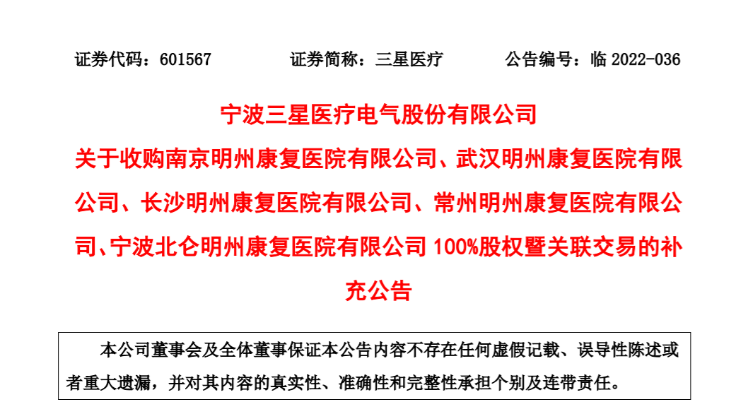 3月28日,三星医疗陆续披露《关于收购南京明州康复医院有限公司 100%股权暨关联交易的公告》、《关于收购武汉明州康复医院有限公司 100%股权暨关联交易的公告》、《关于收购长沙明州康复医院有限公司 100%股权暨关联交易的公告》、《关于收购常州明州康复医院有限公司 100%股权暨关联交易的公告》、《关于收购宁波北仑明州康复医院有限公司 100%股权暨关联交易的公告》,拟以自有资金收购南京明州康复、武汉明州康复、长沙明州康复、常州明州康复、宁波北仑明州康复5家医院100%股权。