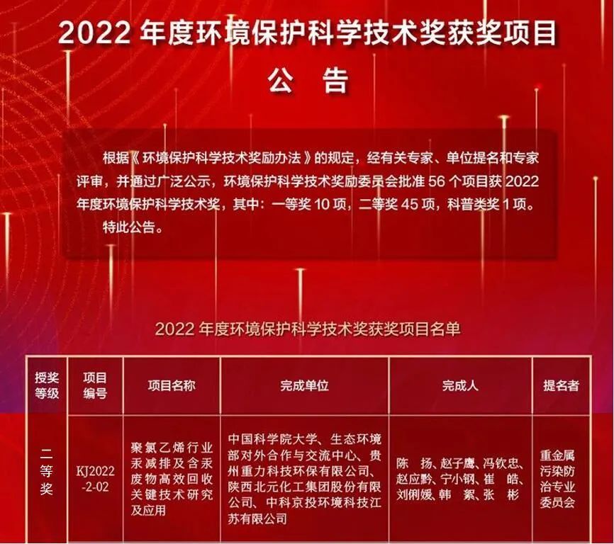 近日,中国环境科学学会发布了2022年度环境保护科学技术奖获奖项目公告,共56个项目获奖。其中,一等奖10项,二等奖45项,科普类奖1项。由北元集团与中国科学院大学、生态环境部对外合作与交流中心等5家单位共同完成的《聚氯乙烯行业汞减排及含汞废物高效回收关键技术研究及应用》项目荣获二等奖。